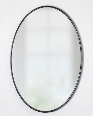 Καθρέπτης κρεμαστός, στρόγγυλος, με μεταλλικό πλαίσιο από λάμα 3cm με ηλεκτροστατική βαφή σε μαύρο ματ χρώμα. Κρέμαση από δερμάτινο λουρί. Η πίσω στήριξη παρέχεται. Καθρέπτης 5mm clear.