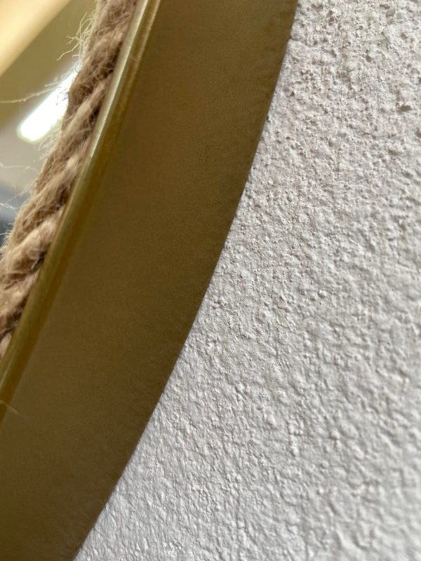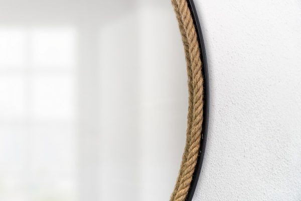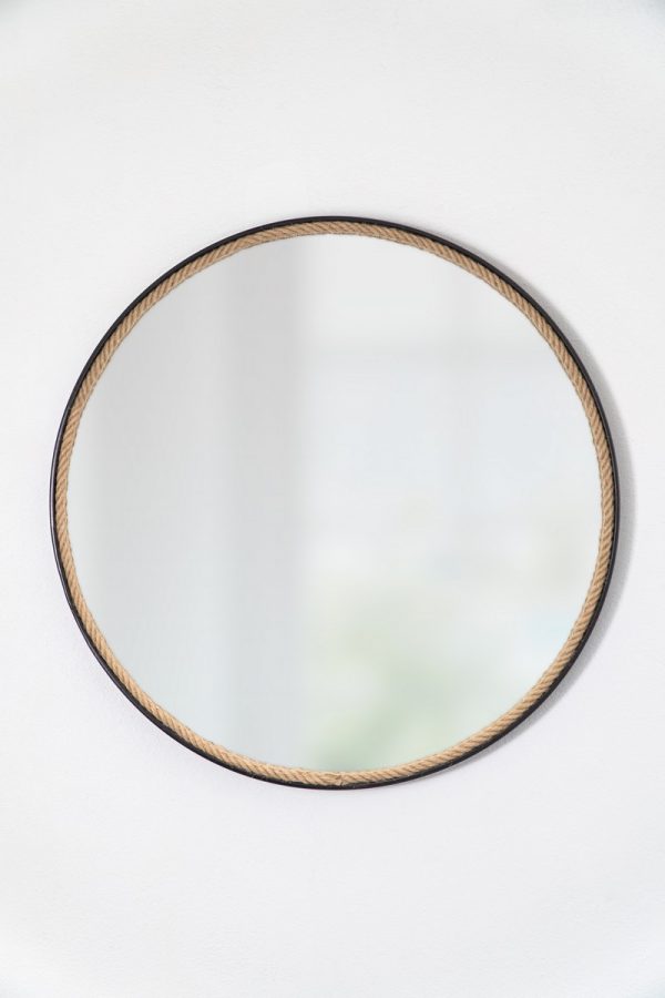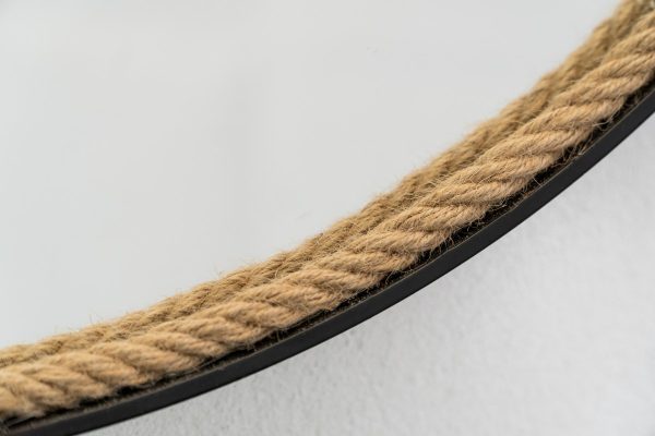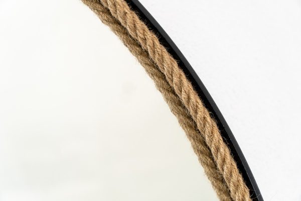 Καθρέπτης κρεμαστός, στρόγγυλος, με μεταλλικό πλαίσιο από λάμα 3cm με ηλεκτροστατική βαφή σε μαύρο και χρυσό ματ χρώμα. Περίγραμμα απο σχοινί γιούτα σε φυσικό χρώμα. Η πίσω στήριξη παρέχεται. Καθρέπτης 5mm clear.