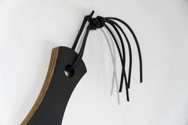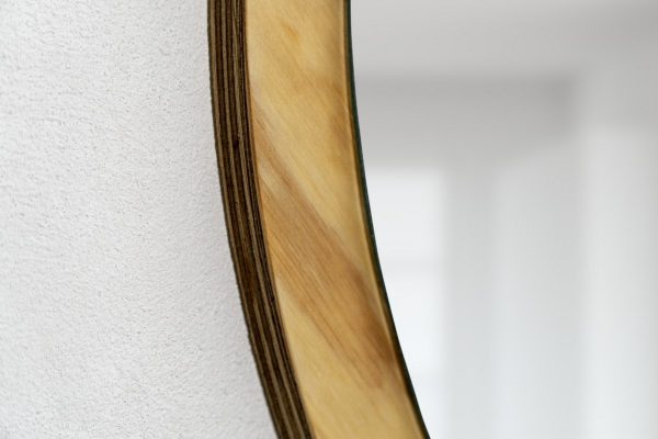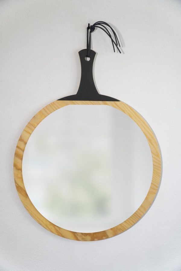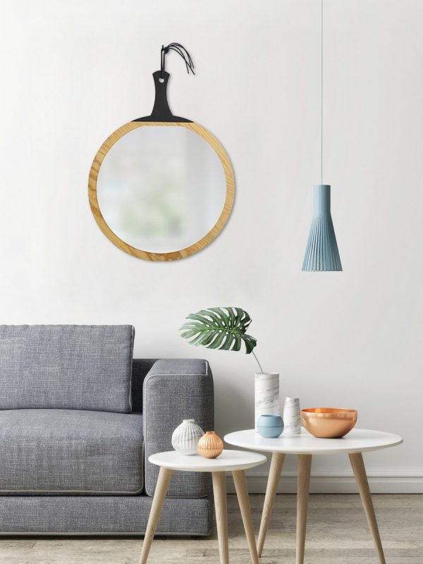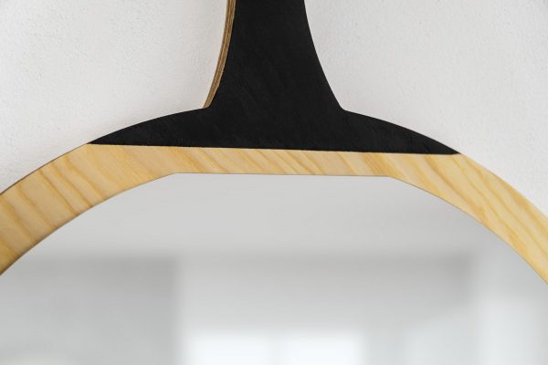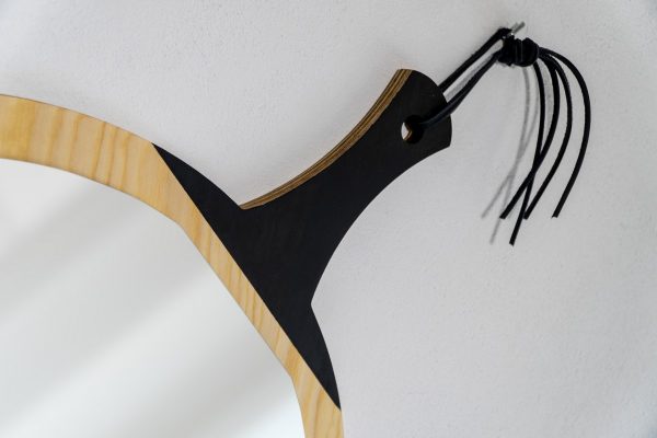 Περίτεχνος κρεμαστός καθρέπτης από ανθεκτικό ξύλο πλακάζ  με επίστρωση απο λάδι ελιάς και στοιχεία από μαύρες λεπτομέρειες και κρέμαση από μαύρο τεχνόδερμα. Η πίσω στήριξη παρέχεται. Καθρέπτης 5mm clear.